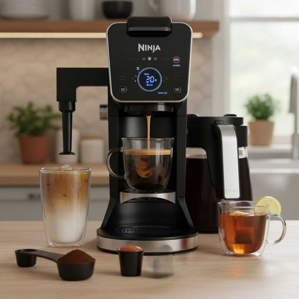 - The Ninja DualBrew Hot & Iced Coffee Maker features a sleek black and stainless-steel design and includes a glass carafe, permanent filter, pod adapter, and smart scoop, with compact dimensions (11.03″ D Γ 9.94″ W Γ 15.22″ H) and smart features like auto shut-off, cup warmer, dishwasher-safe parts, a reusable filter, and a built-in timer for safe, convenient, and flavorful brewing.